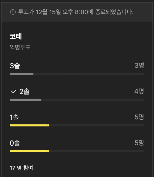 코테 종료 후 오픈 카톡에서 각자 몇 솔 했는지 투표를 했다.